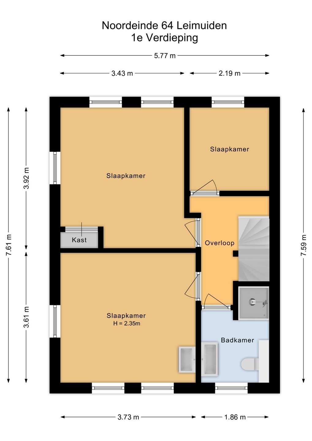 Via de trapopgang bereik je de overloop die toegang biedt tot de drie slaapkamers en de badkamer. Aan de achterzijde van de woning bevindt zich een ruime ouderslaapkamer. Deze kamer heeft veel lichtinval en is comfortabel van formaat. Ook aan de achterzijde is een tweede, kleinere, slaap-/werkkamer. Aan de voorzijde bevind zich nog een grote slaapkamer, deze is voorzien van ramen met horren en een wastafel. De badkamer beschikt over een wastafel, wandcloset en inloopdouche met regendouche.