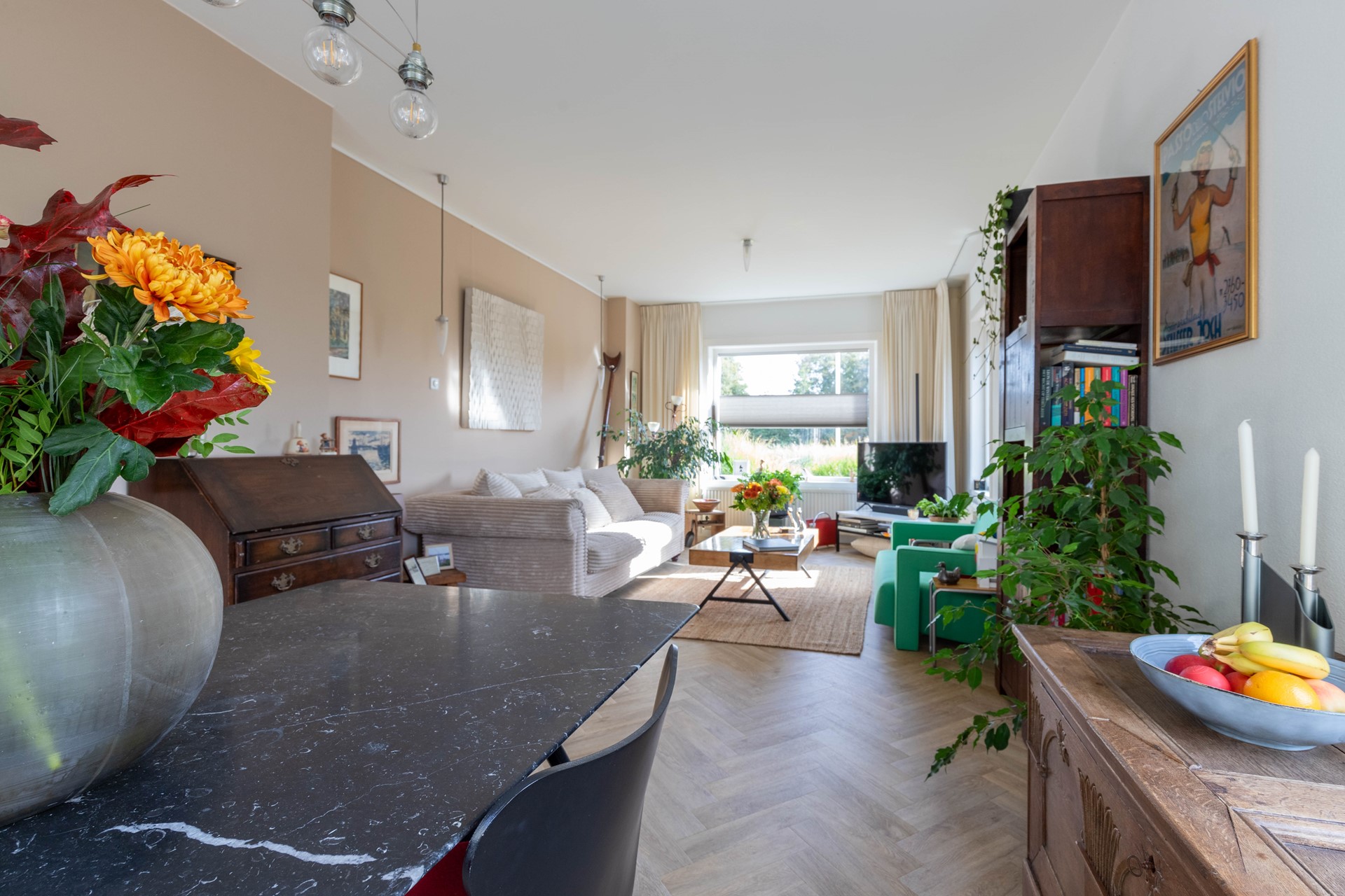 De royale woonkamer is ruim en licht door de ramen aan drie zijden en de gunstige zonligging. De PVC vloer is in visgraat motief gelegd.